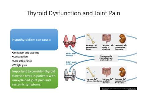 Thyroid Dysfunction and Joint PainHypothyroidism can cause:%u2022Joint pain and swelling%u2022Constipation%u2022Cold intolerance%u2022Weight gainImportant to consider thyroid function tests in patients with unexplained joint pain and systemic symptoms.This Photo by Unknown Author is licensed under CC BY-NC-ND