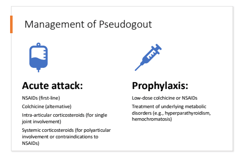 Management of PseudogoutAcute attack:NSAIDs (first-line)Colchicine (alternative)Intra-articular corticosteroids (for single joint involvement)Systemic corticosteroids (for polyarticular involvement or contraindications to NSAIDs)Prophylaxis:Low-dose colchicine or NSAIDsTreatment of underlying metabolic disorders (e.g., hyperparathyroidism, hemochromatosis)