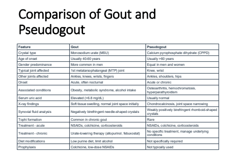 Comparison of Gout and PseudogoutFeature Gout PseudogoutCrystal type Monosodium urate (MSU) Calcium pyrophosphate dihydrate (CPPD)Age of onset Usually 40-60 years Usually >60 yearsGender predominance More common in men Equal in men and womenTypical joint affected 1st metatarsophalangeal (MTP) joint Knee, wristOther joints affected Ankles, knees, wrists, fingers Ankles, shoulders, hipsOnset Acute, often nocturnal Acute or chronicAssociated conditions Obesity, metabolic syndrome, alcohol intake Osteoarthritis, hemochromatosis, hyperparathyroidismSerum uric acid Elevated (>6.8 mg/dL) Usually normalX-ray findings Soft tissue swelling, normal joint space initially Chondrocalcinosis, joint space narrowingSynovial fluid analysis Negatively birefringent needle-shaped crystals Weakly positively birefringent rhomboid-shaped crystalsTophi formation Common in chronic gout RareTreatment - acute NSAIDs, colchicine, corticosteroids NSAIDs, colchicine, corticosteroidsTreatment - chronic Urate-lowering therapy (allopurinol, febuxostat) No specific treatment, manage underlying conditionsDiet modifications Low purine diet, limit alcohol Not specifically requiredProphylaxis Colchicine, low-dose NSAIDs Not typically used