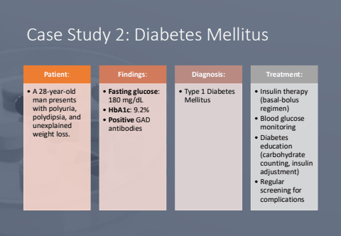 Case Study 2: Diabetes MellitusPatient:%u2022 A 28-year-old man presents with polyuria, polydipsia, and unexplained weight loss.Findings:%u2022 Fasting glucose: 180 mg/dL%u2022 HbA1c: 9.2%%u2022 Positive GAD antibodiesDiagnosis:%u2022 Type 1 Diabetes MellitusTreatment:%u2022 Insulin therapy (basal-bolus regimen)%u2022 Blood glucose monitoring%u2022 Diabetes education (carbohydrate counting, insulin adjustment)%u2022 Regular screening for complications