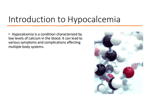 Introduction to Hypocalcemia%u2022 Hypocalcemia is a condition characterized by low levels of calcium in the blood. It can lead to various symptoms and complications affecting multiple body systems.