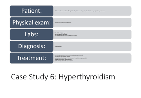 Case Study 6: HyperthyroidismPatient: %u2022 A 35-year-old man complains of weight loss despite increased appetite, heat intolerance, palpitations, and tremors.Physical exam: %u2022 Enlarged thyroid gland, exophthalmos%u2022 TSH: <0 .01 mIU/L (suppressed)%u2022 Free T4: 3.8 ng/dL (elevated) Labs: %u2022 TSI (Thyroid Stimulating Immunoglobulin): positiveDiagnosis %u2022 Graves' Disease :%u2022 Anti-thyroid medications (e.g., methimazole or propylthiouracil)%u2022 Beta-blockers for symptom control%u2022 Radioactive iodine therapy or thyroidectomy if medical management fails%u2022 Regular monitoring of thyroid function Treatment: %u2022 Ophthalmology referral for eye symptoms