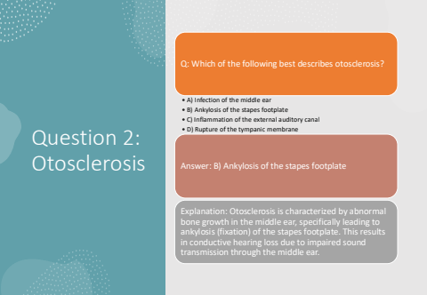 Question 2: OtosclerosisQ: Which of the following best describes otosclerosis?%u2022 A) Infection of the middle ear%u2022 B) Ankylosis of the stapes footplate%u2022 C) Inflammation of the external auditory canal%u2022 D) Rupture of the tympanic membraneAnswer: B) Ankylosis of the stapes footplateExplanation: Otosclerosis is characterized by abnormal bone growth in the middle ear, specifically leading to ankylosis (fixation) of the stapes footplate. This results in conductive hearing loss due to impaired sound transmission through the middle ear.