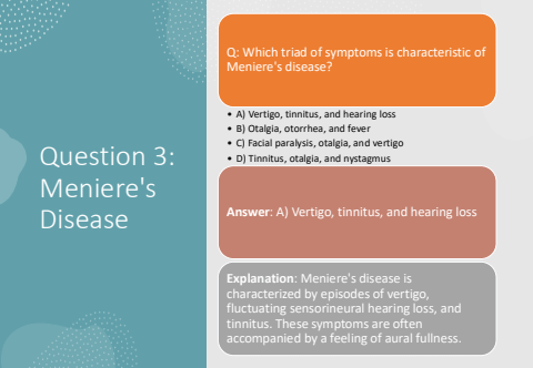 Question 3: Meniere's DiseaseQ: Which triad of symptoms is characteristic of Meniere's disease?%u2022 A) Vertigo, tinnitus, and hearing loss%u2022 B) Otalgia, otorrhea, and fever%u2022 C) Facial paralysis, otalgia, and vertigo%u2022 D) Tinnitus, otalgia, and nystagmusAnswer: A) Vertigo, tinnitus, and hearing lossExplanation: Meniere's disease is characterized by episodes of vertigo, fluctuating sensorineural hearing loss, and tinnitus. These symptoms are often accompanied by a feeling of aural fullness.