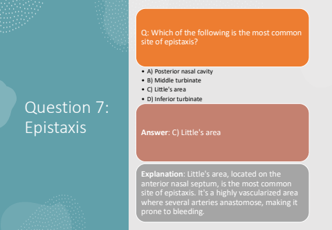 Question 7: EpistaxisQ: Which of the following is the most common site of epistaxis?%u2022 A) Posterior nasal cavity%u2022 B) Middle turbinate%u2022 C) Little's area%u2022 D) Inferior turbinateAnswer: C) Little's areaExplanation: Little's area, located on the anterior nasal septum, is the most common site of epistaxis. It's a highly vascularized area where several arteries anastomose, making it prone to bleeding.