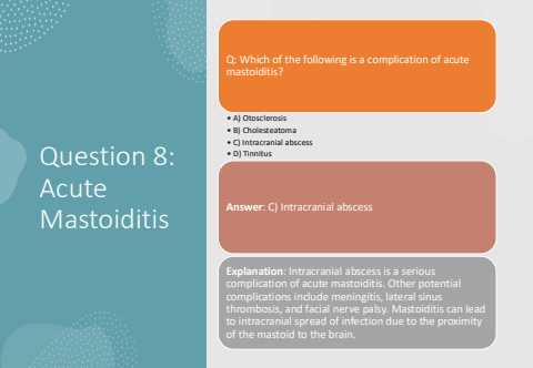 Question 8: Acute MastoiditisQ: Which of the following is a complication of acute mastoiditis?%u2022 A) Otosclerosis%u2022 B) Cholesteatoma%u2022 C) Intracranial abscess%u2022 D) TinnitusAnswer: C) Intracranial abscessExplanation: Intracranial abscess is a serious complication of acute mastoiditis. Other potential complications include meningitis, lateral sinus thrombosis, and facial nerve palsy. Mastoiditis can lead to intracranial spread of infection due to the proximity of the mastoid to the brain.