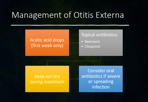 Management of Otitis ExternaAcetic acid drops (first week only)Topical antibiotics:%u2022 Neomycin%u2022 ClioquinolKeep ear dry during treatmentConsider oral antibiotics if severe or spreading infection