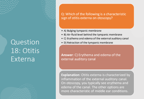 Question 18: Otitis ExternaQ: Which of the following is a characteristic sign of otitis externa on otoscopy?%u2022 A) Bulging tympanic membrane%u2022 B) Air-fluid level behind the tympanic membrane%u2022 C) Erythema and edema of the external auditory canal%u2022 D) Retraction of the tympanic membraneAnswer: C) Erythema and edema of the external auditory canalExplanation: Otitis externa is characterized by inflammation of the external auditory canal. On otoscopy, you typically see erythema and edema of the canal. The other options are more characteristic of middle ear conditions.