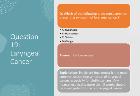 Question 19: Laryngeal CancerQ: Which of the following is the most common presenting symptom of laryngeal cancer?%u2022 A) Dysphagia%u2022 B) Hoarseness%u2022 C) Stridor%u2022 D) OtalgiaAnswer: B) HoarsenessExplanation: Persistent hoarseness is the most common presenting symptom of laryngeal cancer, especially for glottic cancers. Any hoarseness lasting more than 3 weeks should be investigated to rule out laryngeal cancer.