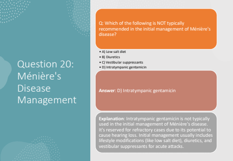 Question 20: M%u00e9ni%u00e8re's Disease ManagementQ: Which of the following is NOT typically recommended in the initial management of M%u00e9ni%u00e8re's disease?%u2022 A) Low salt diet%u2022 B) Diuretics%u2022 C) Vestibular suppressants%u2022 D) Intratympanic gentamicinAnswer: D) Intratympanic gentamicinExplanation: Intratympanic gentamicin is not typically used in the initial management of M%u00e9ni%u00e8re's disease. It's reserved for refractory cases due to its potential to cause hearing loss. Initial management usually includes lifestyle modifications (like low salt diet), diuretics, and vestibular suppressants for acute attacks.