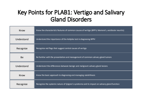 Key Points for PLAB1: Vertigo and Salivary Gland DisordersKnow Know the characteristic features of common causes of vertigo (BPPV, Meniere's, vestibular neuritis)Understand Understand the importance of Dix-Hallpike test in diagnosing BPPVRecognize Recognize red flags that suggest central causes of vertigoBe Be familiar with the presentation and management of common salivary gland tumorsUnderstand Understand the differences between benign and malignant salivary gland lesionsKnow Know the basic approach to diagnosing and managing sialolithiasisRecognize Recognize the systemic nature of Sj%u00f6gren's syndrome and its impact on salivary gland function