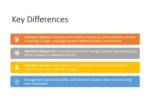 Key DifferencesMeniere's disease is episodic with auditory symptoms, while vestibular neuritis is typically a single, prolonged episode without auditory involvement.Meniere's disease has a characteristic triad of vertigo, tinnitus, and hearing loss, which is absent in vestibular neuritis.Vestibular neuritis often follows a viral infection, while Meniere's disease doesn't have a clear infectious trigger.Management approaches differ, with Meniere's disease often requiring longterm prophylaxis.