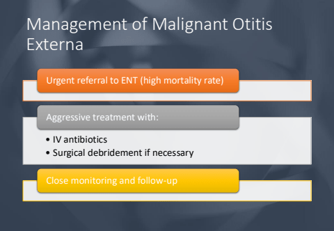 Management of Malignant Otitis ExternaUrgent referral to ENT (high mortality rate)%u2022 IV antibiotics%u2022 Surgical debridement if necessaryAggressive treatment with:Close monitoring and follow-up