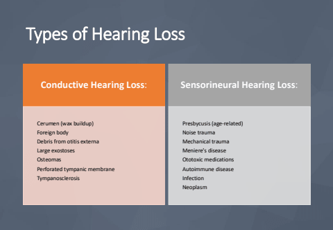 Types of Hearing LossConductive Hearing Loss:Cerumen (wax buildup)Foreign bodyDebris from otitis externaLarge exostosesOsteomasPerforated tympanic membraneTympanosclerosisSensorineural Hearing Loss:Presbycusis (age-related)Noise traumaMechanical traumaMeniere's diseaseOtotoxic medicationsAutoimmune diseaseInfectionNeoplasm