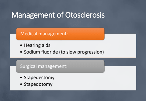 Management of Otosclerosis%u2022 Hearing aids%u2022 Sodium fluoride (to slow progression)Medical management:%u2022 Stapedectomy%u2022 StapedotomySurgical management: