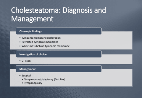 Cholesteatoma: Diagnosis and Management%u2022 Tympanic membrane perforation%u2022 Retracted tympanic membrane%u2022 White mass behind tympanic membraneOtoscopic findings:%u2022 CT scanInvestigation of choice:%u2022 Surgical%u2022 Tympanomastoidectomy (first line)%u2022 TympanoplastyManagement: