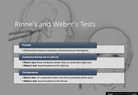 Rinne's and Weber's Tests%u2022Differentiate between conductive and sensorineural hearing lossPurpose:%u2022Rinne's test: Bone conduction better than air conduction (right ear)%u2022Weber's test: Sound localizes to the right earConductive hearing loss in right ear:%u2022Rinne's test: Air conduction better than bone conduction (both ears)%u2022Weber's test: Sound localizes to the left earCholesteatoma:This Photo by Unknown Author is licensed under CC BY-SA
