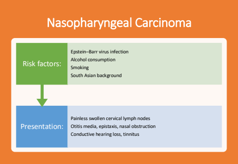 Nasopharyngeal CarcinomaPresentation:Painless swollen cervical lymph nodesOtitis media, epistaxis, nasal obstructionConductive hearing loss, tinnitusRisk factors:Epstein%u2013Barr virus infectionAlcohol consumptionSmokingSouth Asian background