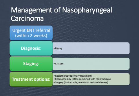 Management of Nasopharyngeal CarcinomaUrgent ENT referral (within 2 weeks)Diagnosis: %u2022BiopsyStaging: %u2022CT scan%u2022Radiotherapy (primary treatment)%u2022Chemotherapy (often combined with radiotherapy)%u2022Surgery (limited role, mainly for residual disease)Treatment options: