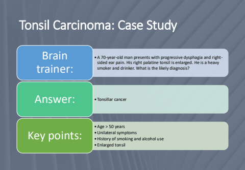 Tonsil Carcinoma: Case Study%u2022A 70-year-old man presents with progressive dysphagia and rightsided ear pain. His right palatine tonsil is enlarged. He is a heavy smoker and drinker. What is the likely diagnosis?Brain trainer:Answer: %u2022Tonsillar cancer%u2022Age > 50 years%u2022Unilateral symptoms%u2022History of smoking and alcohol use%u2022Enlarged tonsilKey points: