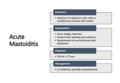 Acute Mastoiditis%u2022 Infection of mastoid air cells, often a complication of acute otitis mediaDefinition:%u2022 Fever, otalgia, otorrhea%u2022 Postauricular swelling and erythema%u2022 Displacement of auricle forward and downwardPresentation:%u2022 Clinical + CT scanDiagnosis:%u2022 IV antibiotics, possible mastoidectomyManagement: