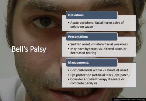 Bell's Palsy%u2022 Acute peripheral facial nerve palsy of unknown causeDefinition:%u2022 Sudden onset unilateral facial weakness%u2022 May have hyperacusis, altered taste, or decreased tearingPresentation:%u2022 Corticosteroids within 72 hours of onset%u2022 Eye protection (artificial tears, eye patch)%u2022 Consider antiviral therapy if severe or complete paralysisManagement:This Photo by Unknown Author is licensed under CC BY-SA