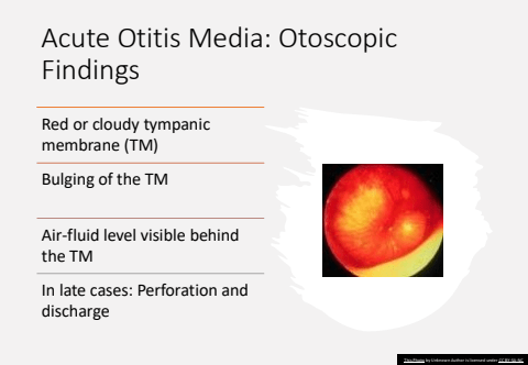 Acute Otitis Media: Otoscopic FindingsRed or cloudy tympanic membrane (TM)Bulging of the TMAir-fluid level visible behind the TMIn late cases: Perforation and dischargeThis Photo by Unknown Author is licensed under CC BY-SA-NC