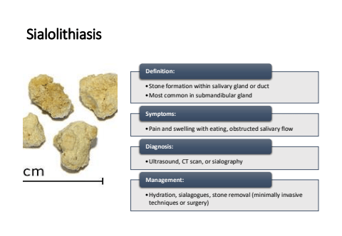 Sialolithiasis%u2022Stone formation within salivary gland or duct%u2022Most common in submandibular glandDefinition:%u2022Pain and swelling with eating, obstructed salivary flowSymptoms:%u2022Ultrasound, CT scan, or sialographyDiagnosis:%u2022Hydration, sialagogues, stone removal (minimally invasive techniques or surgery)Management: