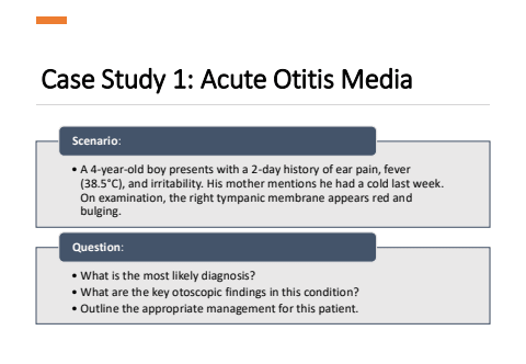 Case Study 1: Acute Otitis Media%u2022 A 4-year-old boy presents with a 2-day history of ear pain, fever (38.5%u00b0C), and irritability. His mother mentions he had a cold last week. On examination, the right tympanic membrane appears red and bulging.Scenario:%u2022 What is the most likely diagnosis?%u2022 What are the key otoscopic findings in this condition?%u2022 Outline the appropriate management for this patient.Question: