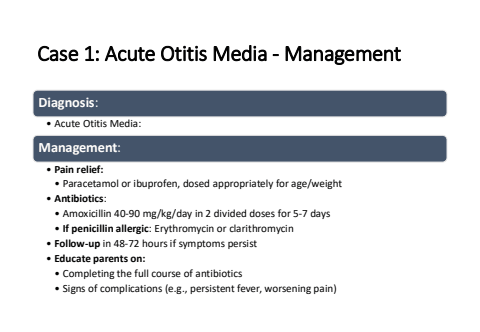 Case 1: Acute Otitis Media - ManagementDiagnosis:%u2022 Acute Otitis Media:Management:%u2022 Pain relief:%u2022 Paracetamol or ibuprofen, dosed appropriately for age/weight%u2022 Antibiotics:%u2022 Amoxicillin 40-90 mg/kg/day in 2 divided doses for 5-7 days%u2022 If penicillin allergic: Erythromycin or clarithromycin%u2022 Follow-up in 48-72 hours if symptoms persist%u2022 Educate parents on:%u2022 Completing the full course of antibiotics%u2022 Signs of complications (e.g., persistent fever, worsening pain)