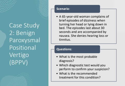 Case Study 2: Benign Paroxysmal Positional Vertigo (BPPV)%u2022 A 65-year-old woman complains of brief episodes of dizziness when turning her head or lying down in bed. The episodes last about 30 seconds and are accompanied by nausea. She denies hearing loss or tinnitus.Scenario:%u2022 What is the most probable diagnosis?%u2022 Which diagnostic test would you perform to confirm your suspicion?%u2022 What is the recommended treatment for this condition?Questions: