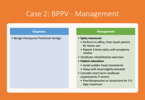 Case 2: BPPV - ManagementDiagnosis:%u2022 Benign Paroxysmal Positional VertigoManagement%u2022 Epley maneuver:%u2022 Perform in-office, then teach patient for home use%u2022 Repeat 3 times daily until symptoms resolve%u2022 Vestibular rehabilitation exercises%u2022 Patient education:%u2022 Avoid sudden head movements%u2022 Sleep with head slightly elevated%u2022 Consider short-term vestibular suppressants if severe:%u2022 Prochlorperazine or cinnarizine for 3-5 days maximum