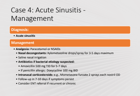 Case 4: Acute Sinusitis -ManagementDiagnosis:%u2022 Acute sinusitisManagement%u2022 Analgesia: Paracetamol or NSAIDs%u2022 Nasal decongestants: Xylometazoline drops/spray for 3-5 days maximum%u2022 Saline nasal irrigation%u2022 Antibiotics if bacterial etiology suspected:%u2022 Amoxicillin 500 mg TID for 5-7 days%u2022 If penicillin allergic: Doxycycline 100 mg BID%u2022 Intranasal corticosteroids: e.g., Mometasone furoate 2 sprays each nostril OD%u2022 Follow-up in 7-10 days if symptoms persist%u2022 Consider ENT referral if recurrent or chronic