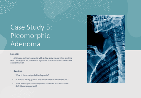 Case Study 5: Pleomorphic AdenomaScenario:%u2022 A 50-year-old man presents with a slow-growing, painless swelling near the angle of his jaw on the right side. The mass is firm and mobile on examination.%u2022 Question:%u2022 What is the most probable diagnosis?%u2022 In which salivary gland is this tumor most commonly found?%u2022 What investigations would you recommend, and what is the definitive management?