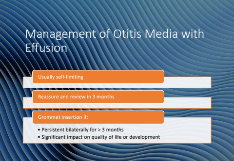 Management of Otitis Media with EffusionUsually self-limitingReassure and review in 3 months%u2022 Persistent bilaterally for > 3 months%u2022 Significant impact on quality of life or developmentGrommet insertion if: