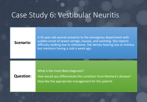 Case Study 6: Vestibular NeuritisA 35-year-old woman presents to the emergency department with sudden onset of severe vertigo, nausea, and vomiting. She reports difficulty walking due to imbalance. She denies hearing loss or tinnitus but mentions having a cold a week ago.Scenario:What is the most likely diagnosis?How would you differentiate this condition from Meniere's disease?Describe the appropriate management for this patient.Question: