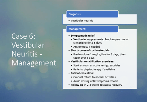 Case 6: Vestibular Neuritis -Management%u2022 Vestibular neuritisDiagnosis:%u2022 Symptomatic relief:%u2022 Vestibular suppressants: Prochlorperazine or cinnarizine for 3-5 days%u2022 Antiemetics if needed%u2022 Short course of corticosteroids:%u2022 Prednisolone 1 mg/kg/day for 5 days, then taper over 5 days%u2022 Vestibular rehabilitation exercises:%u2022 Start as soon as acute vertigo subsides%u2022 Refer to physiotherapy if available%u2022 Patient education:%u2022 Gradual return to normal activities%u2022 Avoid driving until symptoms resolve%u2022 Follow-up in 2-4 weeks to assess recoveryManagement: