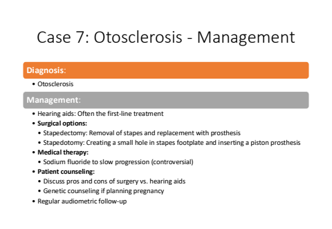 Case 7: Otosclerosis - ManagementDiagnosis:%u2022 OtosclerosisManagement:%u2022 Hearing aids: Often the first-line treatment%u2022 Surgical options:%u2022 Stapedectomy: Removal of stapes and replacement with prosthesis%u2022 Stapedotomy: Creating a small hole in stapes footplate and inserting a piston prosthesis%u2022 Medical therapy:%u2022 Sodium fluoride to slow progression (controversial)%u2022 Patient counseling:%u2022 Discuss pros and cons of surgery vs. hearing aids%u2022 Genetic counseling if planning pregnancy%u2022 Regular audiometric follow-up