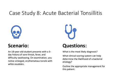 Case Study 8: Acute Bacterial TonsillitisScenario:An 18-year-old student presents with a 3-day history of sore throat, fever, and difficulty swallowing. On examination, you notice enlarged, erythematous tonsils with white exudates.Questions:What is the most likely diagnosis?What clinical scoring system can help determine the likelihood of a bacterial etiology?Outline the appropriate management for this patient.