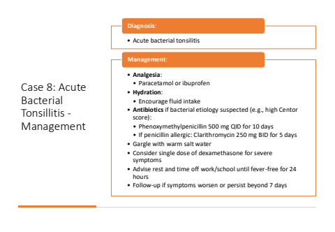 Case 8: Acute Bacterial Tonsillitis -Management%u2022 Acute bacterial tonsilitisDiagnosis:%u2022 Analgesia:%u2022 Paracetamol or ibuprofen%u2022 Hydration:%u2022 Encourage fluid intake%u2022 Antibiotics if bacterial etiology suspected (e.g., high Centorscore):%u2022 Phenoxymethylpenicillin 500 mg QID for 10 days%u2022 If penicillin allergic: Clarithromycin 250 mg BID for 5 days%u2022 Gargle with warm salt water%u2022 Consider single dose of dexamethasone for severe symptoms%u2022 Advise rest and time off work/school until fever-free for 24 hours%u2022 Follow-up if symptoms worsen or persist beyond 7 daysManagement: