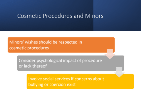 Cosmetic Procedures and MinorsMinors' wishes should be respected in cosmetic proceduresConsider psychological impact of procedure or lack thereofInvolve social services if concerns about bullying or coercion exist