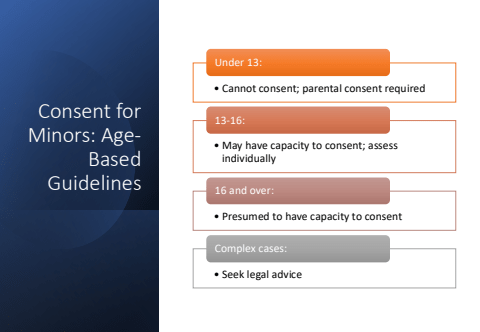 Consent for Minors: AgeBased Guidelines%u2022 Cannot consent; parental consent requiredUnder 13:%u2022 May have capacity to consent; assess individually13-16:%u2022 Presumed to have capacity to consent16 and over:%u2022 Seek legal adviceComplex cases: