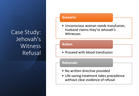 Case Study: Jehovah's Witness Refusal%u2022 Unconscious woman needs transfusion; husband claims they're Jehovah's WitnessesScenario:%u2022 Proceed with blood transfusionAction:%u2022 No written directive provided%u2022 Life-saving treatment takes precedence without clear evidence of refusalRationale: