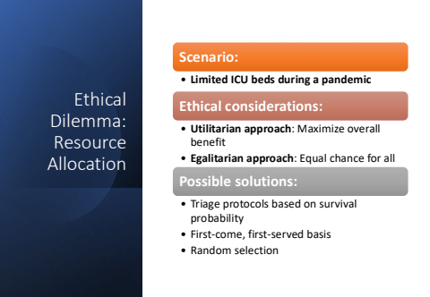 Ethical Dilemma: Resource AllocationScenario:%u2022 Limited ICU beds during a pandemicEthical considerations:%u2022 Utilitarian approach: Maximize overall benefit%u2022 Egalitarian approach: Equal chance for allPossible solutions:%u2022 Triage protocols based on survival probability%u2022 First-come, first-served basis%u2022 Random selection