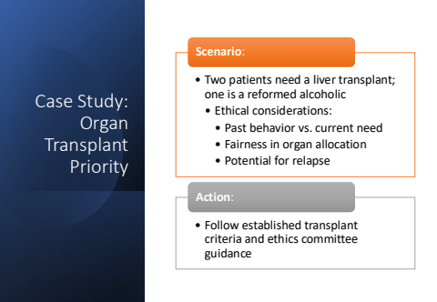 Case Study: Organ Transplant Priority%u2022 Two patients need a liver transplant; one is a reformed alcoholic%u2022 Ethical considerations:%u2022 Past behavior vs. current need%u2022 Fairness in organ allocation%u2022 Potential for relapseScenario:%u2022 Follow established transplant criteria and ethics committee guidanceAction: