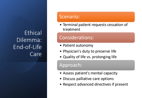 Ethical Dilemma: End-of-Life CareScenario:%u2022 Terminal patient requests cessation of treatmentConsiderations:%u2022 Patient autonomy%u2022 Physician's duty to preserve life%u2022 Quality of life vs. prolonging lifeApproach:%u2022 Assess patient's mental capacity%u2022 Discuss palliative care options%u2022 Respect advanced directives if present