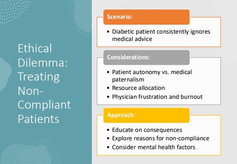 Ethical Dilemma: Treating NonCompliant Patients%u2022 Diabetic patient consistently ignores medical adviceScenario:%u2022 Patient autonomy vs. medical paternalism%u2022 Resource allocation%u2022 Physician frustration and burnoutConsiderations:%u2022 Educate on consequences%u2022 Explore reasons for non-compliance%u2022 Consider mental health factorsApproach: