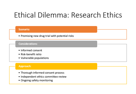 Ethical Dilemma: Research Ethics%u2022 Promising new drug trial with potential risksScenario:%u2022 Informed consent%u2022 Risk-benefit ratio%u2022 Vulnerable populationsConsiderations:%u2022 Thorough informed consent process%u2022 Independent ethics committee review%u2022 Ongoing safety monitoringApproach: