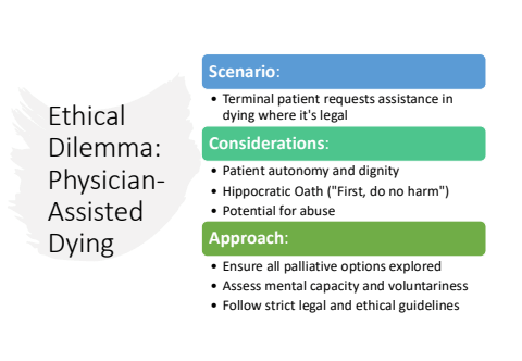 Ethical Dilemma: PhysicianAssisted DyingScenario:%u2022 Terminal patient requests assistance in dying where it's legalConsiderations:%u2022 Patient autonomy and dignity%u2022 Hippocratic Oath (\%u2022 Potential for abuseApproach:%u2022 Ensure all palliative options explored%u2022 Assess mental capacity and voluntariness%u2022 Follow strict legal and ethical guidelines