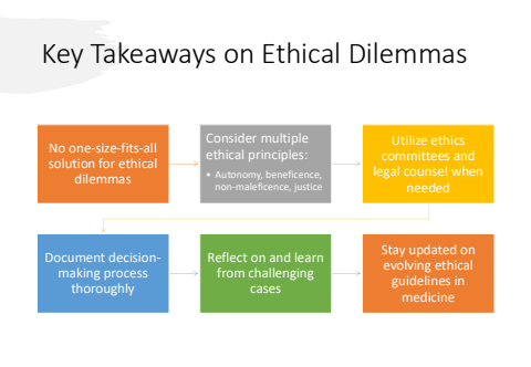 Key Takeaways on Ethical DilemmasNo one-size-fits-all solution for ethical dilemmasConsider multiple ethical principles:%u2022 Autonomy, beneficence, non-maleficence, justiceUtilize ethics committees and legal counsel when neededDocument decisionmaking process thoroughlyReflect on and learn from challenging casesStay updated on evolving ethical guidelines in medicine